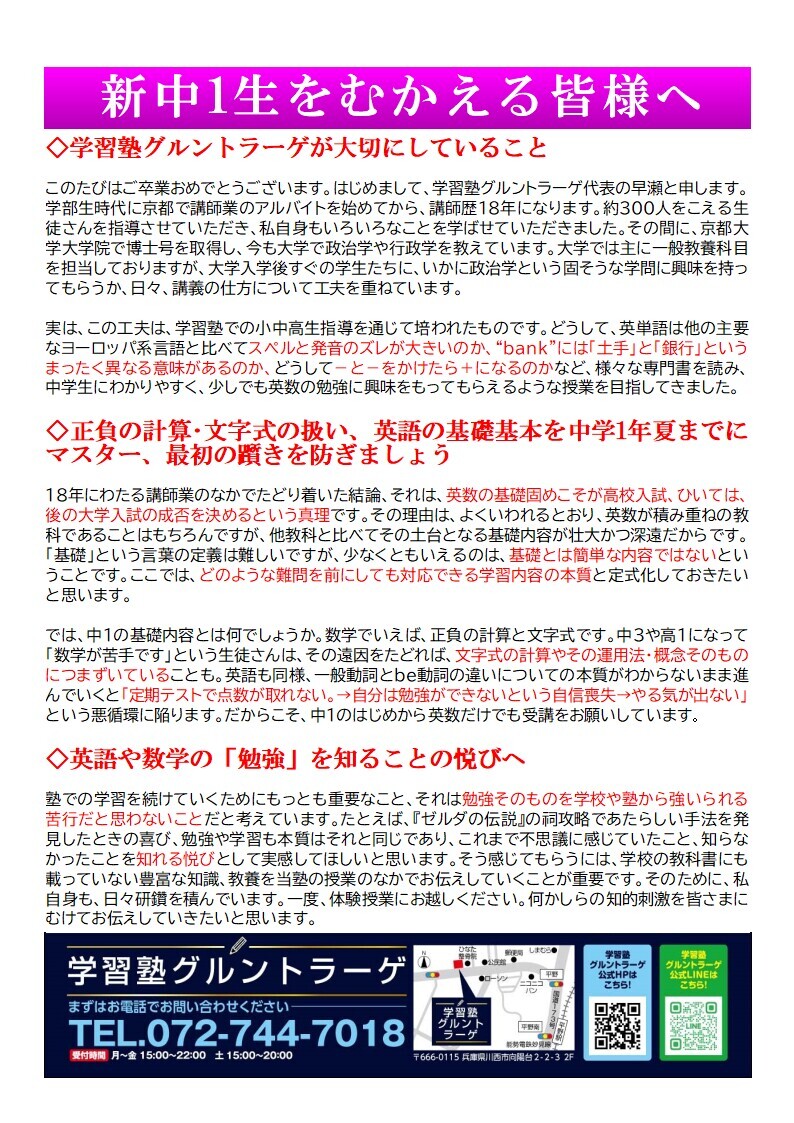 ということで、あらためて、本日は、学習塾グルントラーゲが大切にしていることを新中1生の皆様に向けて発信させてください。