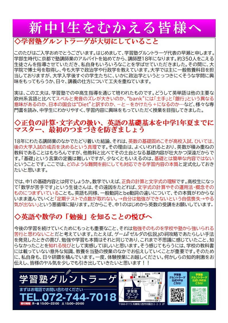 まずは、はじめての定期試験(新中1は例年、中間テストがなく期末のみ)までわれわれと頑張ってみませんか?? お電話か公式LINEにてご連絡のほど、お待ちしております。